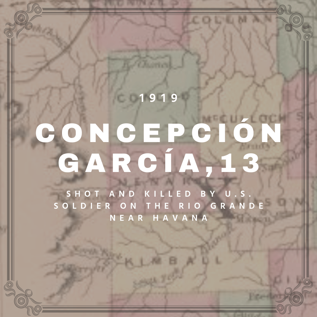 In April 1919, nine-year-old Concepción García lived in Texas to attend school. She became ill and needed to return home to Mexico to recover. With the help of her mother, Maria, and aunt, Concepción attempted to cross the Rio Grande into Mexico. As Concepcíon’s father, Teodoro, looked on from the Mexican bank, he witnessed Lieutenant Gulley of the U.S. Cavalry firing at his family. Concepcíon was shot and died from her injuries. A court martial investigated the shooting and found that Gulley was guilty of manslaughter for firing on unarmed persons. Despite the court finding, acting on the advice of the board of review, the judge advocate general, and the secretary of war, U.S. President Woodrow Wilson ordered the lieutenant freed. Lieutenant Gulley was restored to military duty in September 1919.
